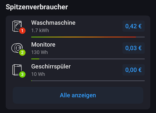 Über den Reiter “Mehr” lassen sich nicht nur die Spitzenreiter einsehen, sondern alle Stromverbraucher deines Smart Homes. Wir selbst überwachen hier sehr gerne den Stromverbrauch unserer Waschmaschine und unseres Geschirrspülers. Wie bereits bei der allgemeinen Übersicht, lassen sich nach dem Pflegen der Kosten je Kilowattstunde in den Einstellungen, die einzelnen Stromkosten der Geräte überprüfen.