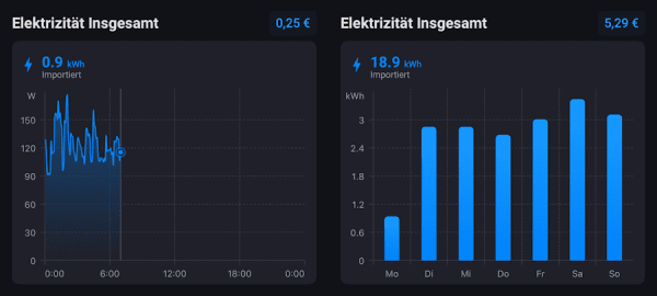 Da wir selbst zum jetzigen Zeitpunkt noch keine PV-Anlage besitzen, sehen wir lediglich den bezogenen Stromverbrauch aus dem Netz. Bei Nutzung einer PV-Anlage und eines vorhandenen Wechselrichters würde man zudem noch einsehen können, wie viel Strom durch Sonnenenergie produziert und verbraucht/eingespeist wird. So erkennt man auch auf einen Blick, ob man gerade mehr Strom erzeugt, als man verbraucht und ob damit der Speicher geladen oder ins Stromnetz eingespeist wird.